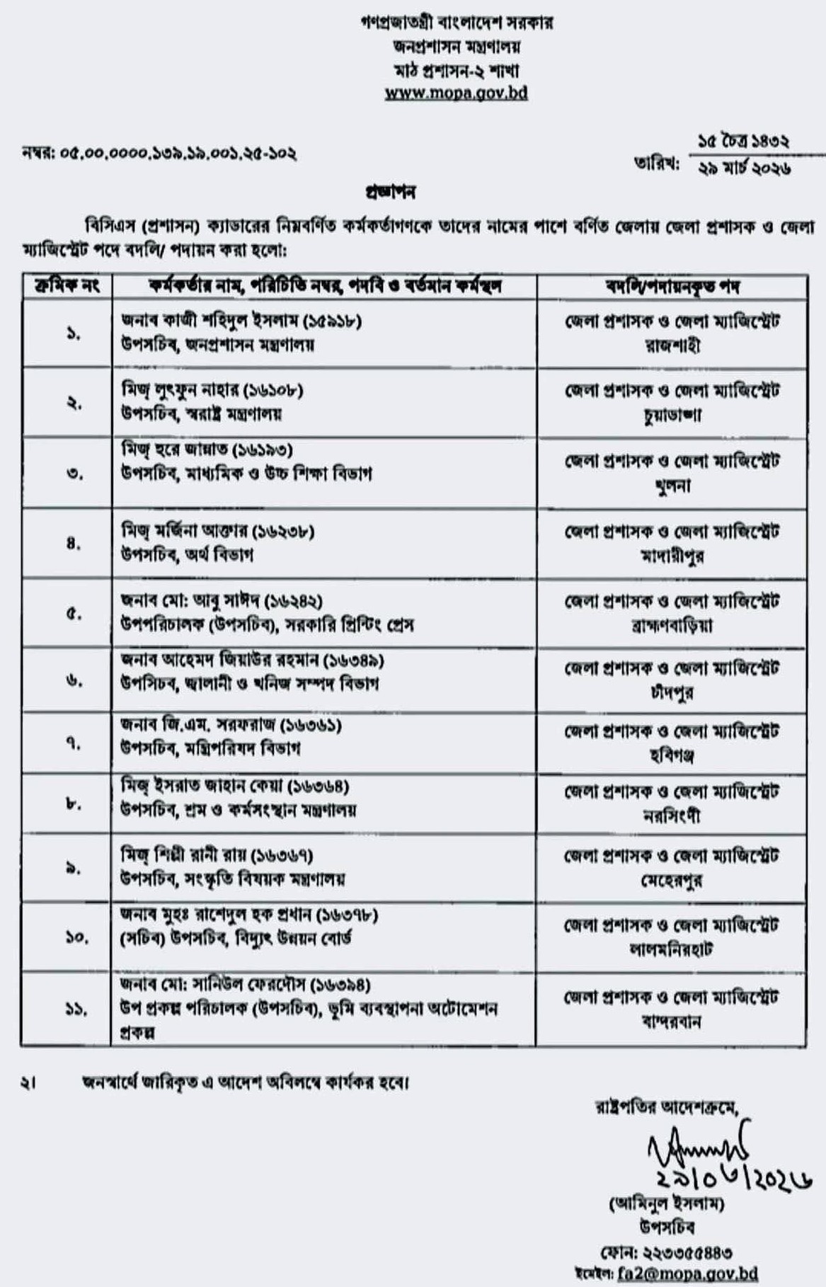 প্রজ্ঞাপনের তথ্য অনুযাযী- জনপ্রশাসন মন্ত্রণালয়ের উপসচিব কাজী শহিদুল ইসলামকে রাজশাহী, স্বরাষ্ট্র মন্ত্রণালয়ের উপসচিব লুৎফুন নাহারকে চুয়াডাঙ্গা, মাধ্যমিক ও উচ্চশিক্ষা বিভাগের উপসচিব হরে জান্নাতকে খুলনা, অর্থ বিভাগের উপসচিব মর্জিনা আক্তারকে মাদারীপুর, জ্বালানি ও খনিজসম্পদ বিভাগের উপসচিব আহেমদ জিয়াউর রহমানকে চাঁদপুর, মন্ত্রিপরিষদ বিভাগের উপসচিব জিএম, সরফরাজকে হবিগঞ্জ, শ্রম ও কর্মসংস্থান মন্ত্রণালয়ের উপসচিব ইসরাত জাহান কেয়াকে নরসিংদী, সংস্কৃতি বিষয়ক মন্ত্রণালয়ের উপসচিব শিল্পী রানী রায়কে মেহেরপুর, বিদ্যুৎ উন্নয়ন বোর্ডের (সচিব) উপসচিব মুহ. রাশেদুল হক প্রধানকে লালমনিরহাট এবং ভূমি ব্যবস্থাপনা অটোমেশন প্রকল্পের উপপ্রকল্প পরিচালক (উপসচিব) মো. সানিউল ফেরদৌসকে বান্দরবানের জেলা প্রশাসক করা হয়েছে।