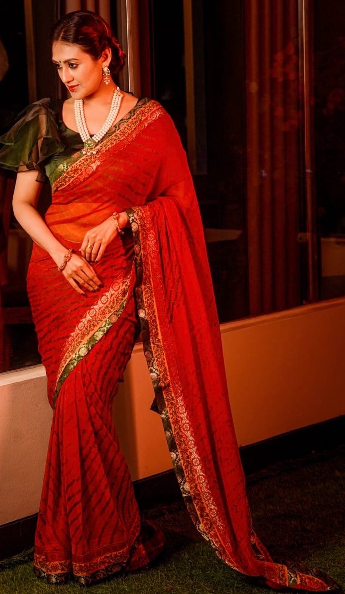 লাল শাড়ি এবং সবুজ ব্লাউজ পরে, গলায় সুন্দর মুক্তার হার এবং হাতে চটকদার ব্রেসলেটে ধরা দিয়েছেন। কুসুম শিকদারের নতুন লুকটি দেখে ভক্তরা রীতিমতো মুগ্ধ। তার অভিনয় দক্ষতার মাধ্যমে দর্শকদের মুগ্ধ করে আসছেন।