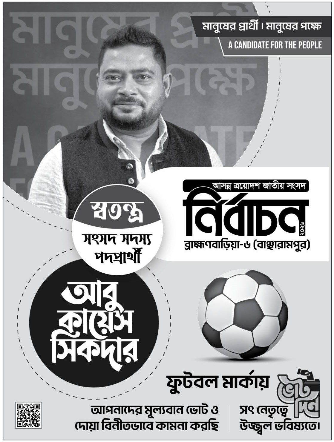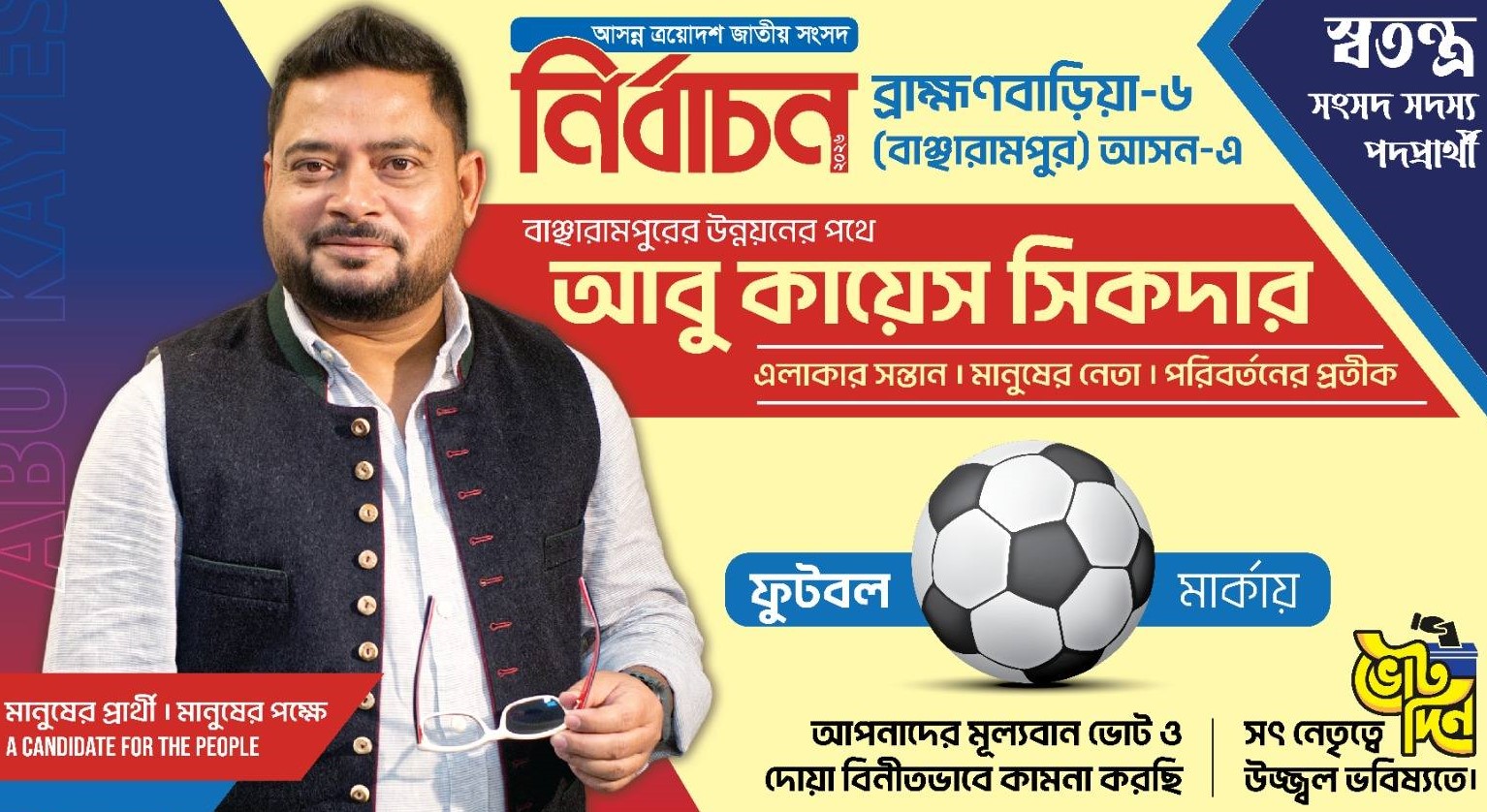 কায়েস সিকদার: বাঞ্ছারামপুর বার্তা পত্রিকার প্রতিও আমার ভালবাসা রইল। এই পত্রিকার মাধ্যমে আমি আবারও বাঞ্ছারামপুরবাসীর কাছে ফুটবল মার্কায় ভোট ও দোয়া চাই।